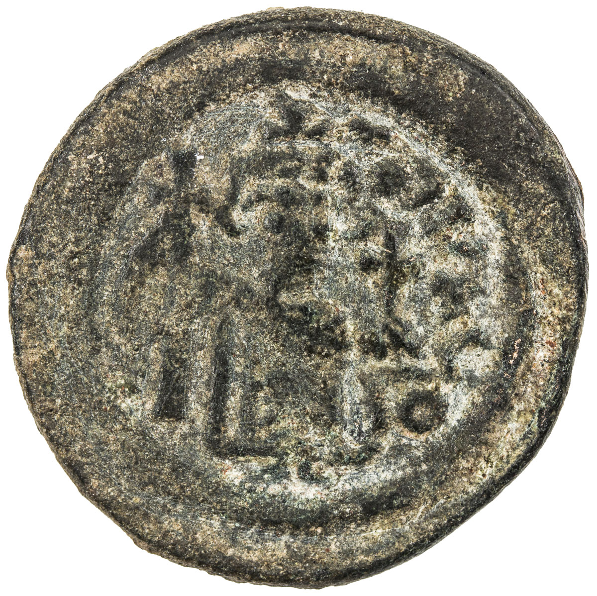 Islamic - Early Pre-Reform,ARAB-BYZANTINE: Standing Emperor, ca. 670s-680s, AE fals (3.39g), Damascus, year "17", A-3517.1, fancy fleur-de-lys left, ΛEO right , capital M, Greek inscriptions only, VF, S.