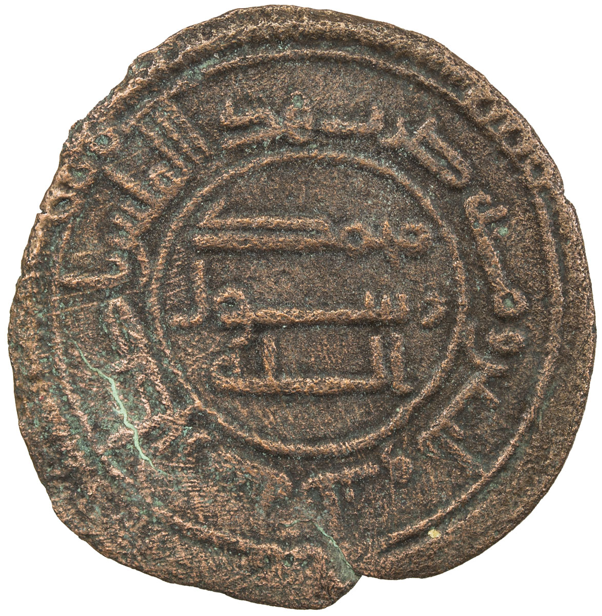 Islamic - Umayyad & Abbasid,UMAYYAD: AE fals (2.54g), al-Mansura, ND, A-A204, rare mint, then the capital of Sind, citing and uncertain governors name, style of circa AH110s-130s, Fine, RRR.