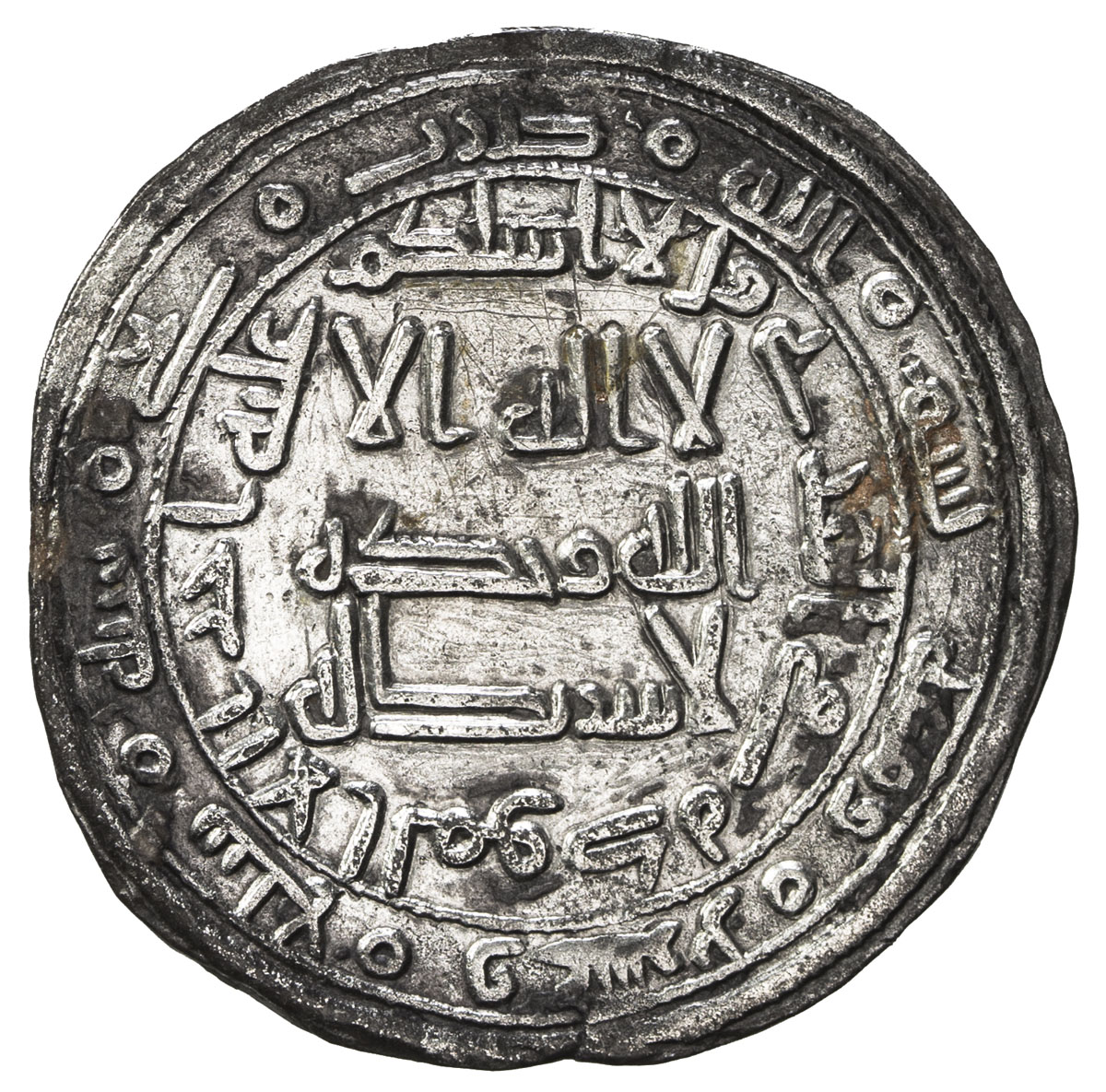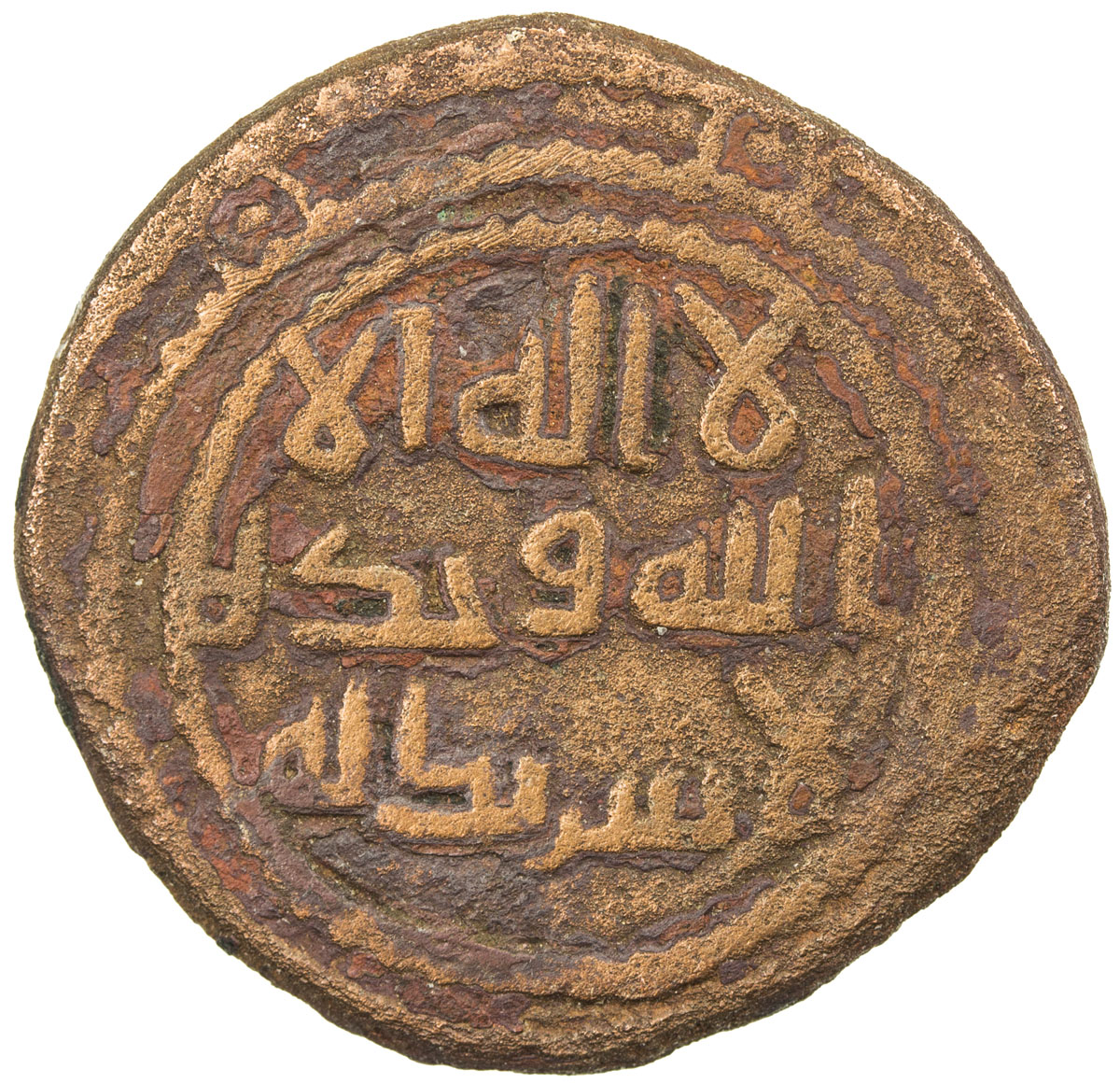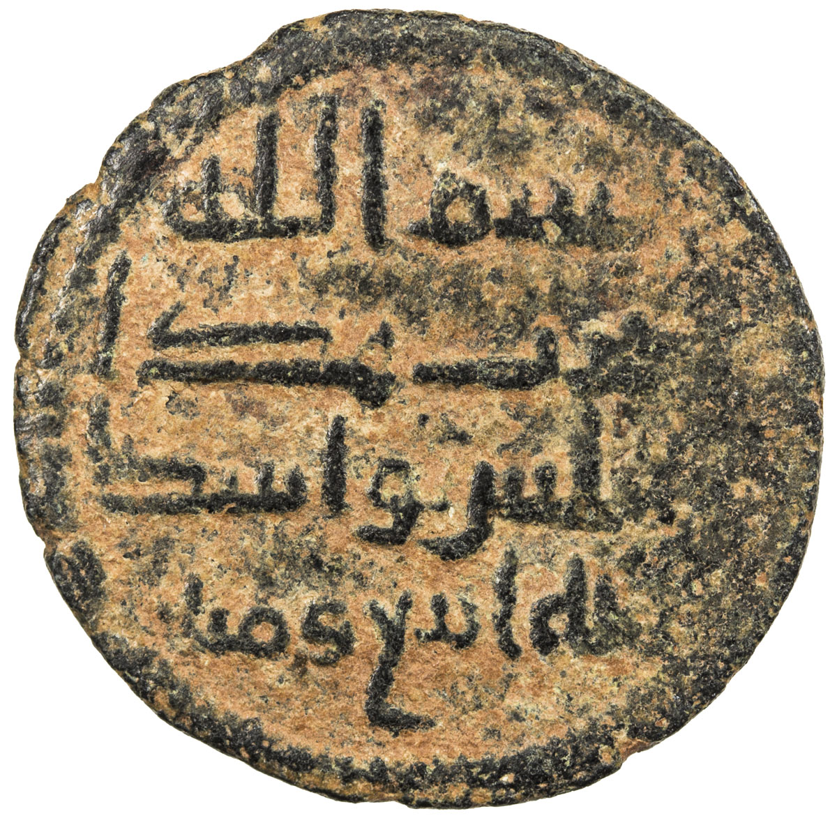 Islamic - Umayyad & Abbasid,UMAYYAD: AE fals (2.98g), Darabjird, AH117, A-199, first half of kalima divided between obverse & reverse, the second half in the reverse margin, followed by arsalahu bil-huda wa din al-haqq, pleasing Fine, RRR. The only oth ...
