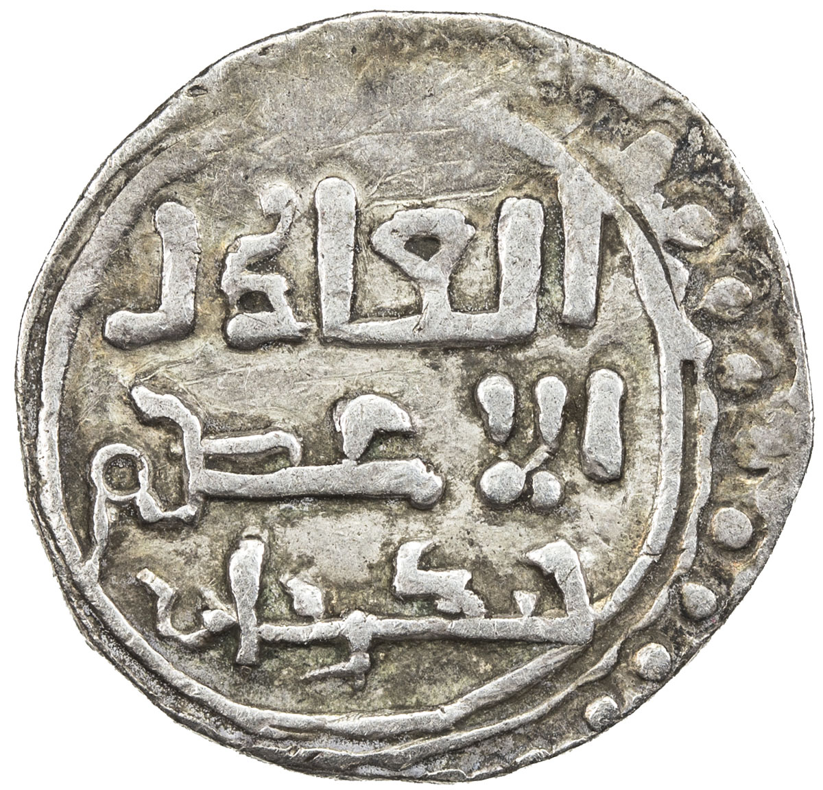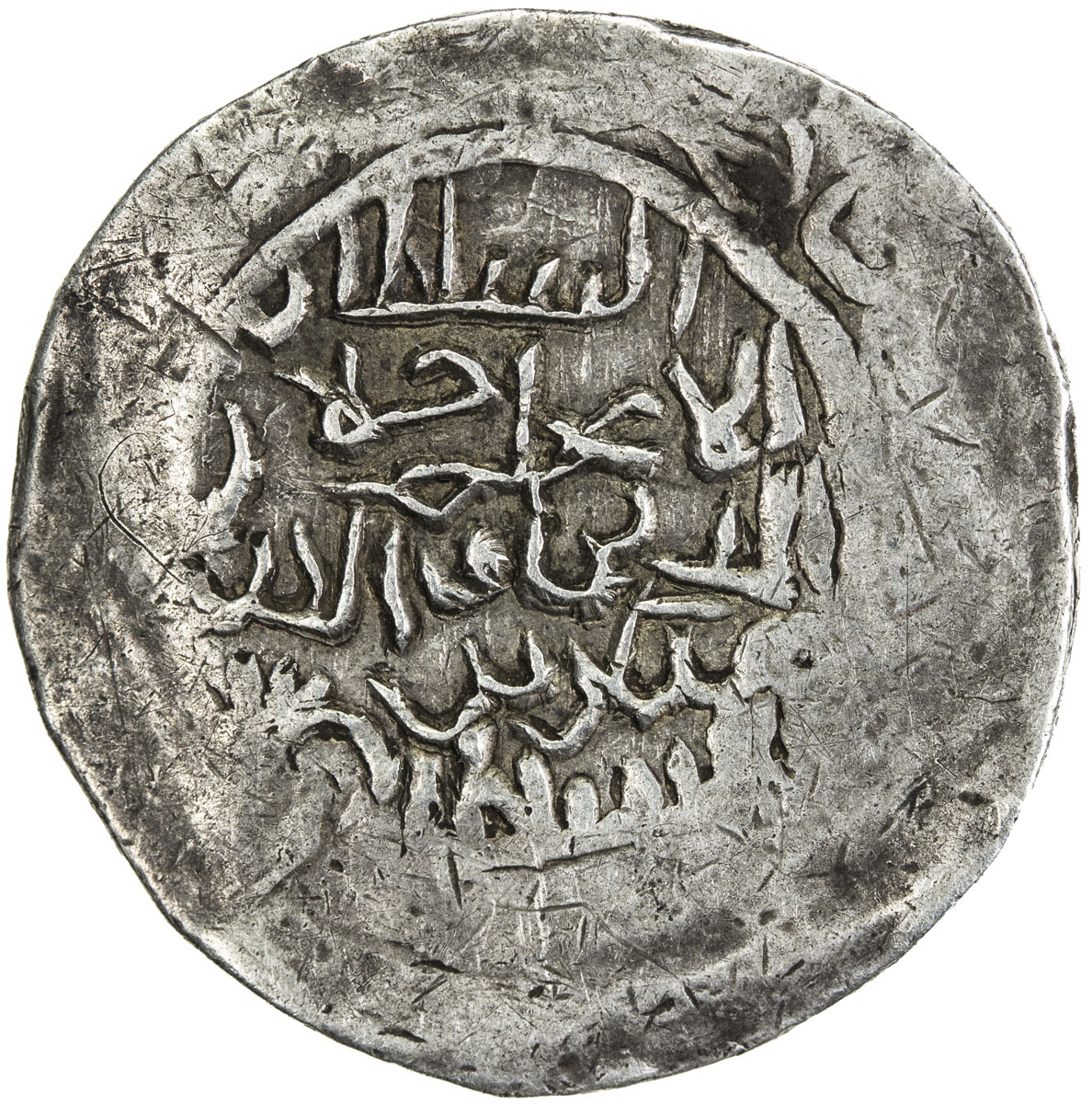 Islamic - Iran (The Seljuq Period),KHWARIZMSHAH: Mangubarni, 1220-1231, AR broad dirham (7.32g), MM, ND, A-1744, either without mint or mint off flan, citing caliph al-Nasir li-din Allah, about 20% flat strike, VF, RR.