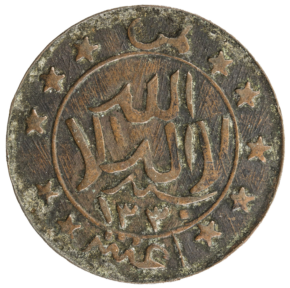 World Coins - Asia & Middle-East,KATHIRI STATE OF SEIYUN & TARIM: Ghalib ibn Muhsin al-Kathir, 1830-1880, AE khumsi, Tarim, AH1258, KM-205, Eastern Aden Protectorate, semi-prooflike fields, PCGS graded MS63 RB, RRR. The finest known example in our opinion and extremely rare in mint state quality!