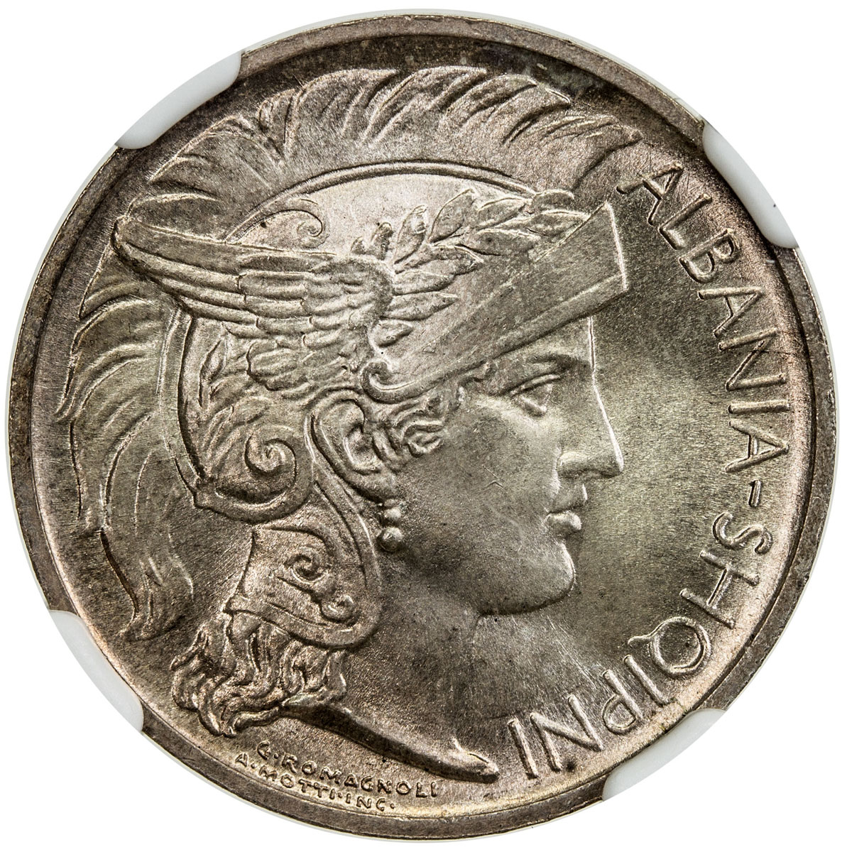World Coins - Europe,ALBANIA: Republic, AR frang ar, 1927-R, KM-6, a superb example! NGC graded MS67. Giuseppe Romagnoli was an Italian medalist and sculptor. Romagnolis skills were eventually recognized by the Rome Mint, and he was given a job at the i ...