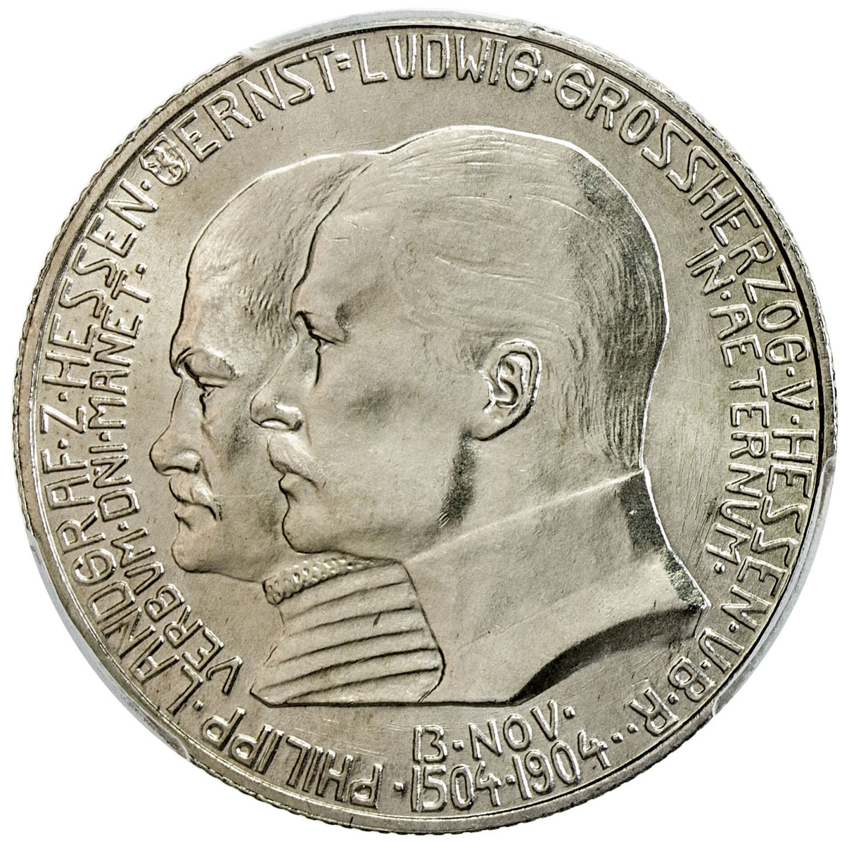 World Coins - Europe,HESSE-DARMSTADT: Ernst Ludwig, 1892-1918, AR 2 mark, 1904, KM-372, 400th Birthday of Philipp the Magnanimous, PCGS graded Proof 66, ex Jess Peters Auction, January 19, 1984, Lot 967.