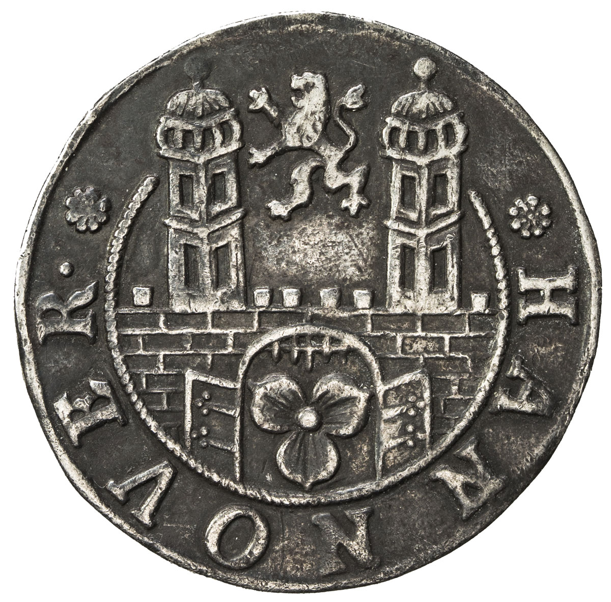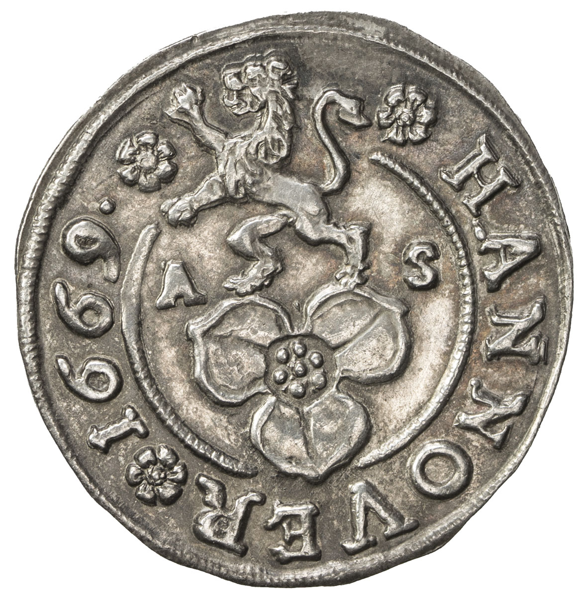 World Coins - Europe,HANOVER: AR 12 mariengroschen (7.11g), 1669-AS, KM-79, flower before city gate, lion above, choice VF, ex Don Erickson Collection.