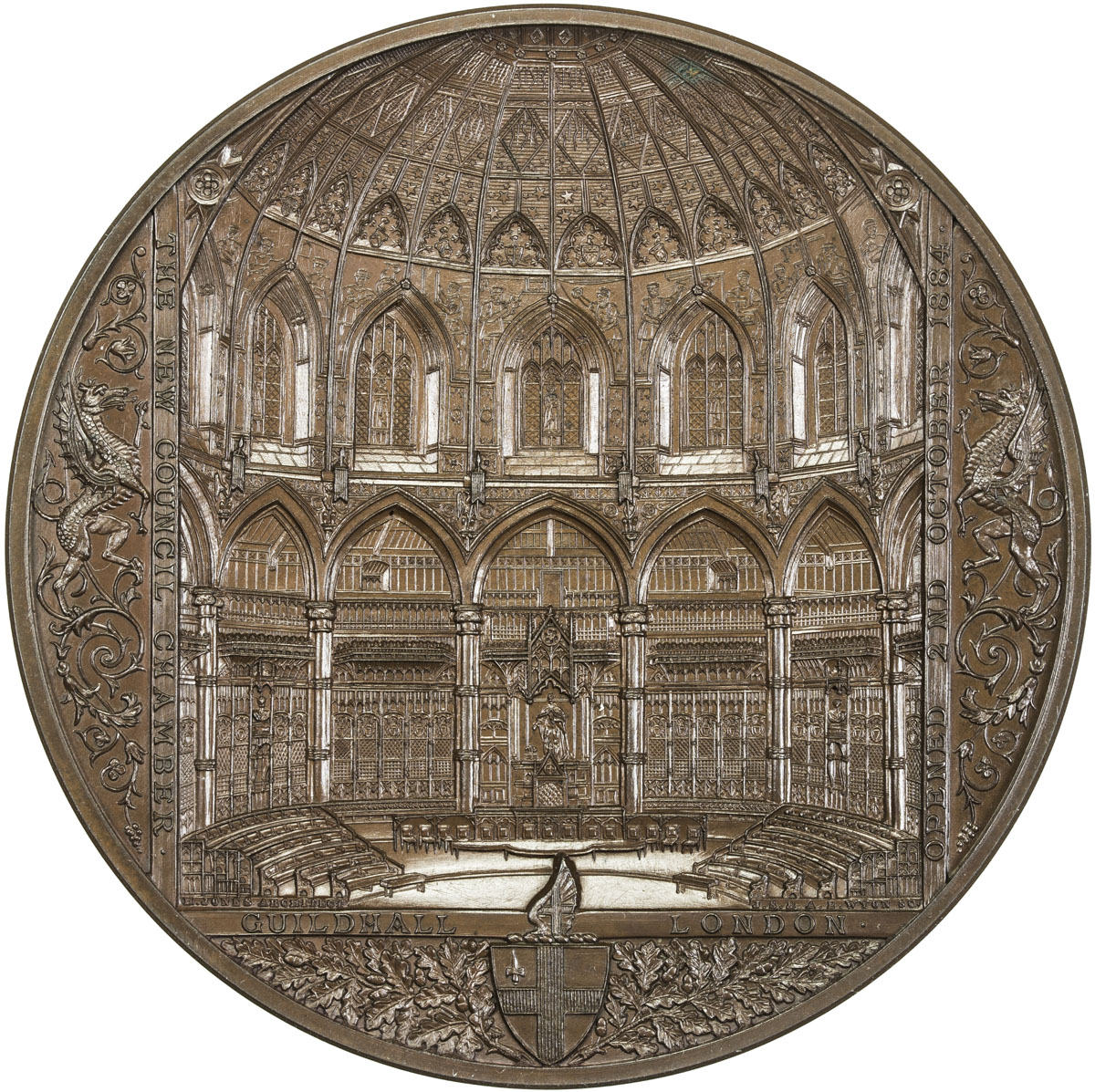 World Coins - Europe,GREAT BRITAIN: AE medal, 1884, BHM-3177; Eimer-1705; Welch-19, 77mm, bronze medal by J. S. and A. B. Wyon, The New Council Chamber of the Guildhall for the Corporation of the City of London, detailed interior view of the council chamb ...