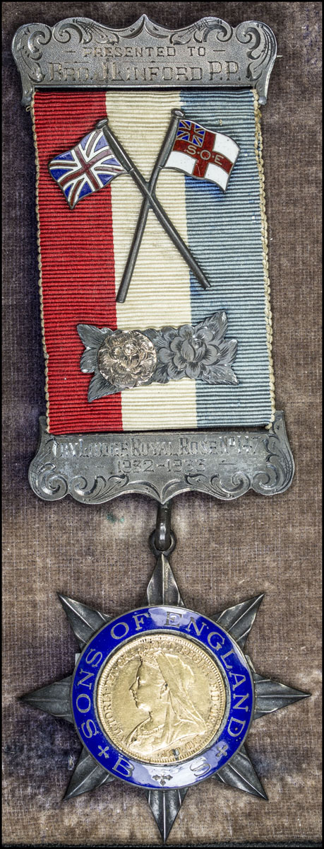 World Coins - Europe,GREAT BRITAIN:silver & gold award medal, hanger hand engraved PRESENTED TO / BRO. J. LINFORD P.P. above red, white and blue tricolor ribbon enblazened with Union Jack and Royal Navy flags in full color, silver and gold roses below, bo ...