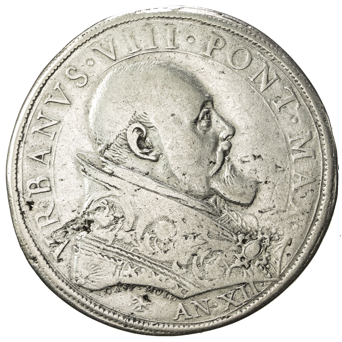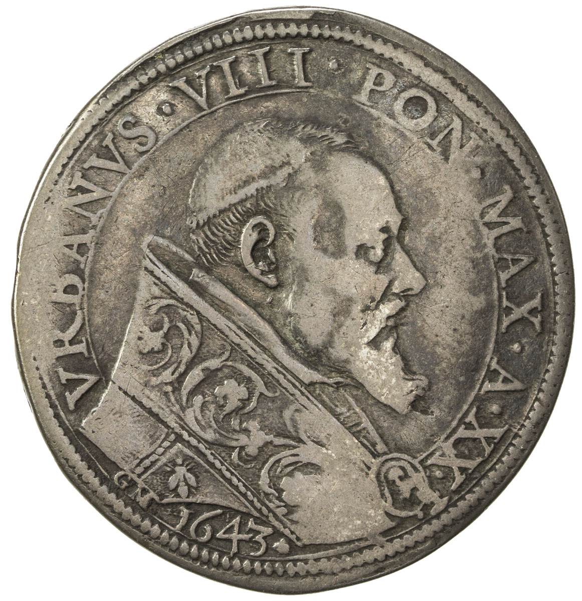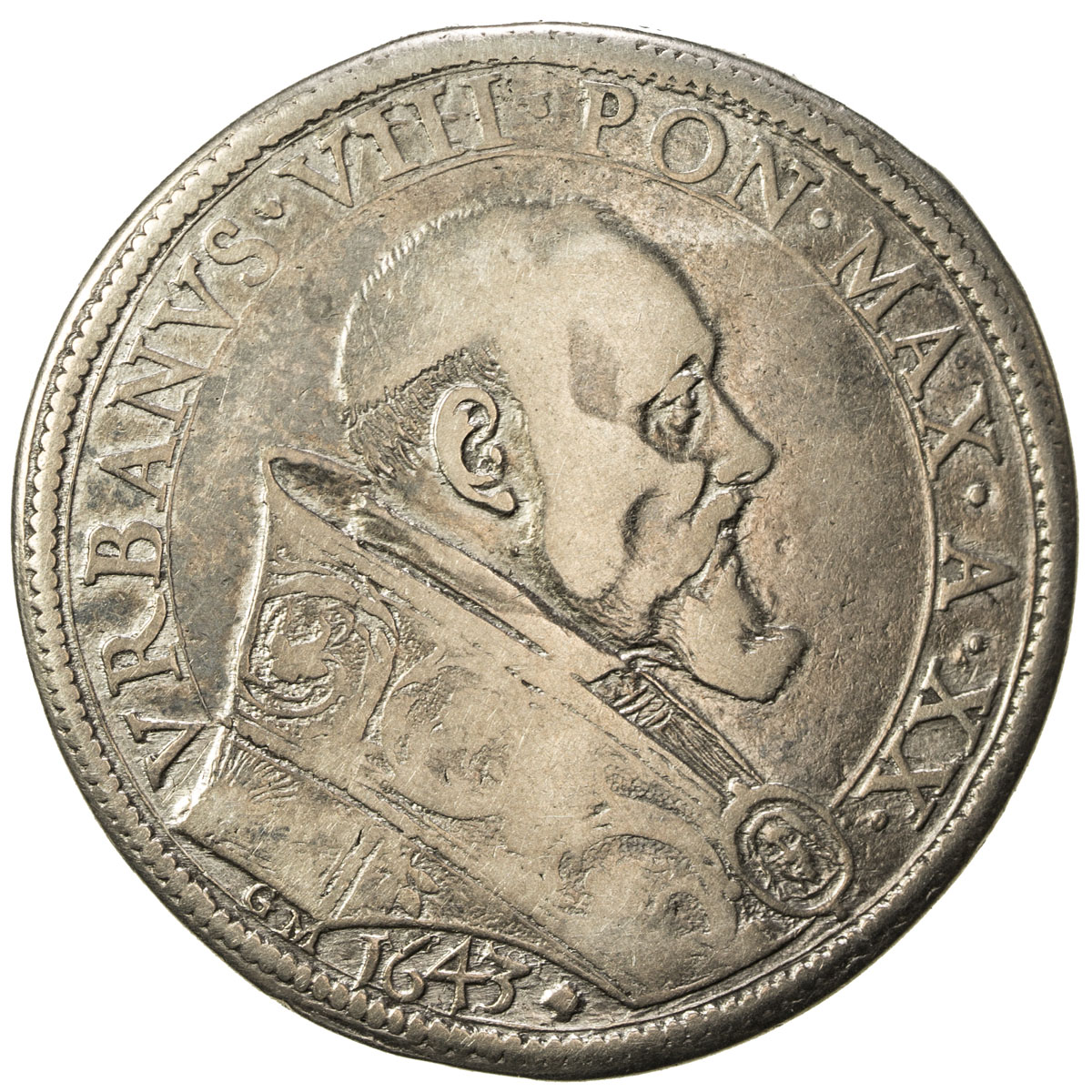 World Coins - Europe,PAPAL STATES: Urban VIII, 1623-1644, AR piastra, 1643, KM-205, Dav-4061, Berman-1709, busts of St. Peter and St. Paul with Radiant Dove above, uneven strike, reverse rim nick, Very Good to Fine, R.