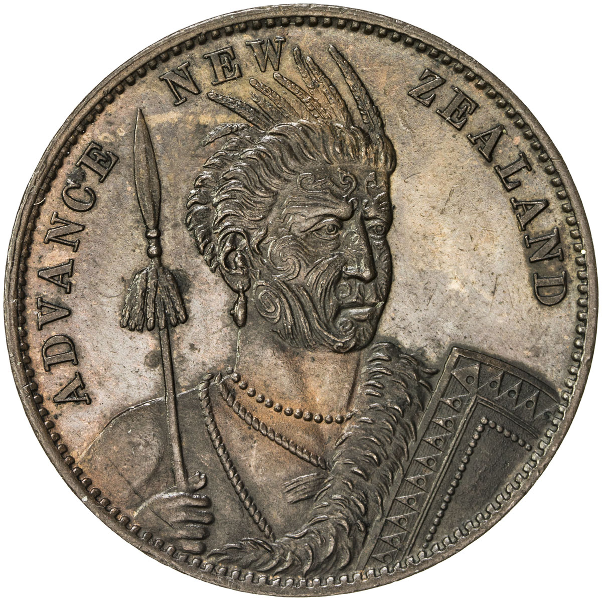 World Coins - Australia & Pacific,NEW ZEALAND: AE penny token, ND, KM-Tn49, Maori Warrior with moko (facial tattoo) holding spear and shield with ADVANCE NEW ZEALAND around , Maori warrior by palm tree with sword and shield. Waka (canoe), kiwi, mountain a ...