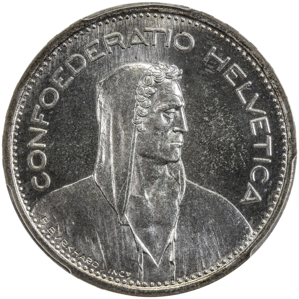 World Coins - Europe,SWITZERLAND: AR 5 francs, 1940-B, KM-40, William Tell, just a hint of toning, PCGS graded MS66 Secure Holder, ex Mike Edwards Collection.