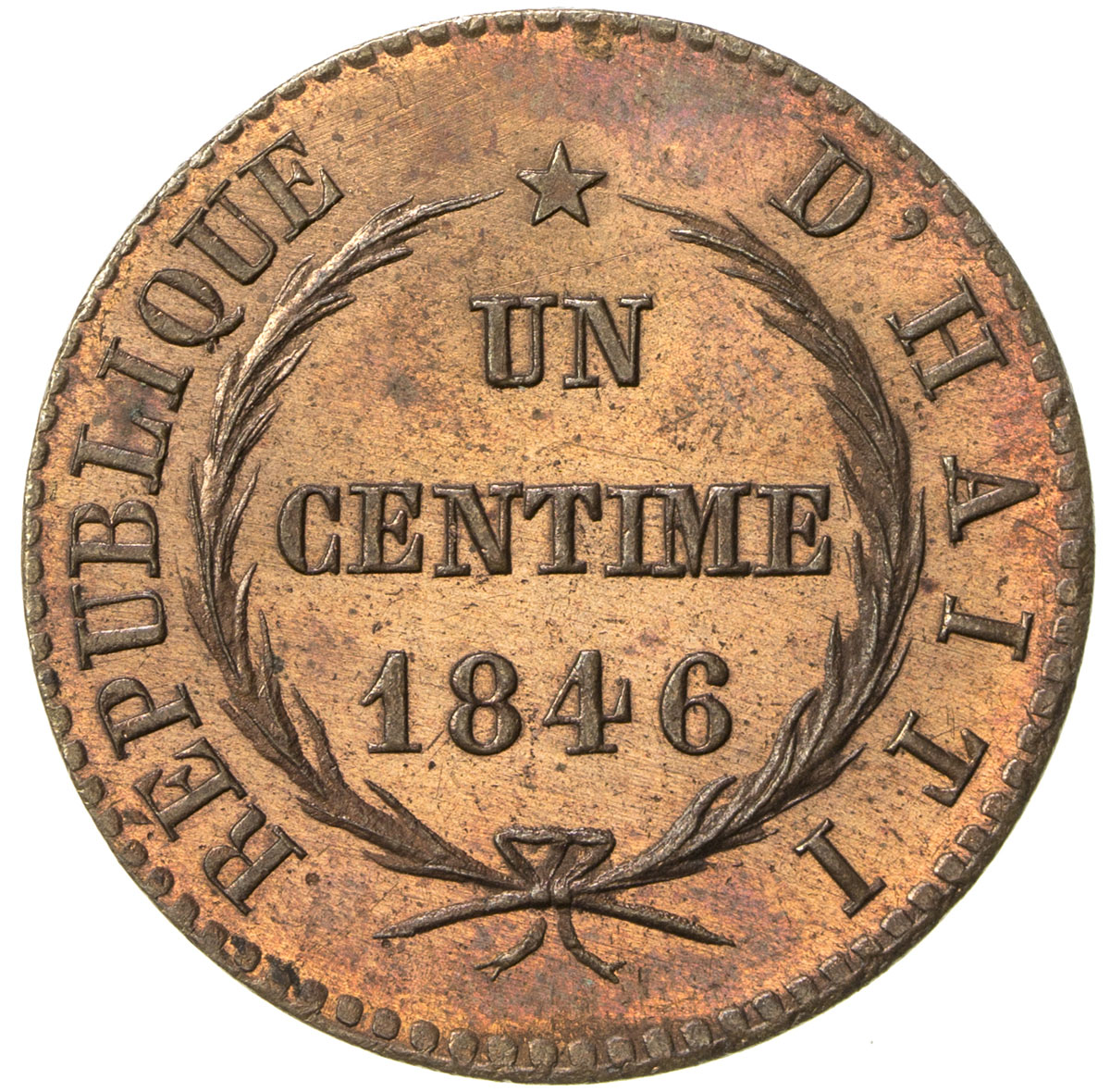 World Coins - The Americas,HAITI: Republic, AE centime, 1846/AN 43, KM-24, fasces divides value, small liberty cap above, brilliant lustrous prooflike surfaces, Unc. This type is distinguished by the broadest flan of the three 1846 types and known as th ...