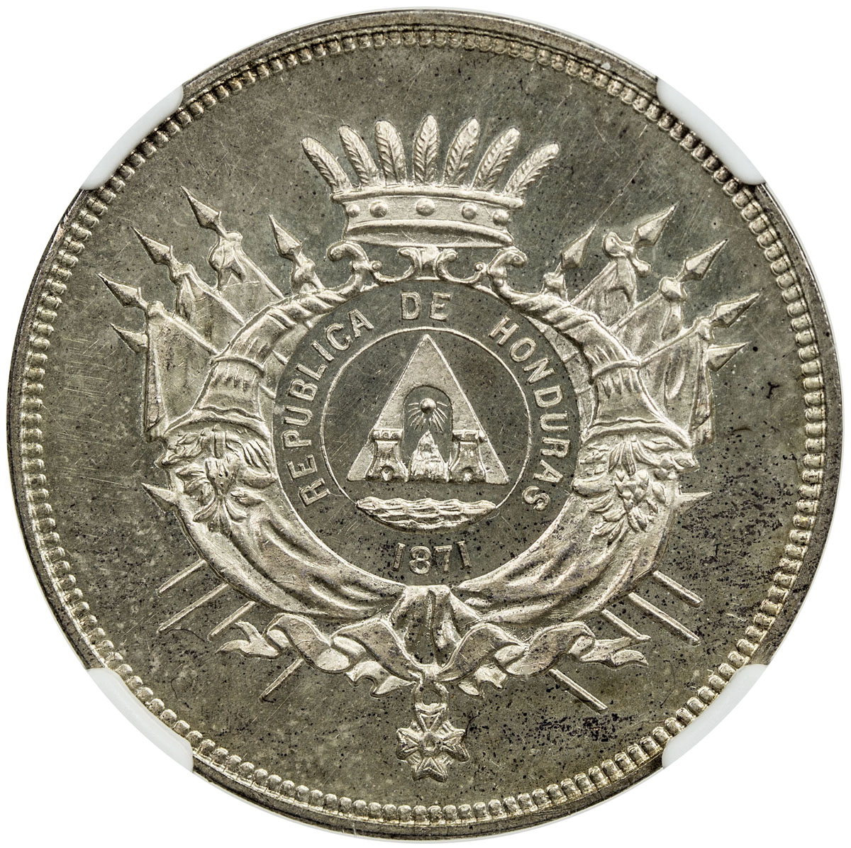 World Coins - The Americas,HONDURAS: Republic, AR 50 centavos, 1871, as KM-37, NGC graded Proof 64, RRR. Philadelphia Mint silver plain-edged proof pattern. This piece is the finest of 2 known. The other, ex Richard Stuart Collection in PF-63, was sold ...