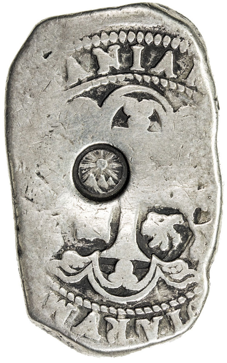 World Coins - The Americas,GUATEMALA: AR 8 reales (25.59g), ND, KM-105.2, with type II Guatemala countermark (sun over 3 volcanos) on Mexico klippe style 8 reales, KM-48, 1733 MoF of Filipe V (1700-1746), full date and clear assayers initial, Fine, R, ex ...