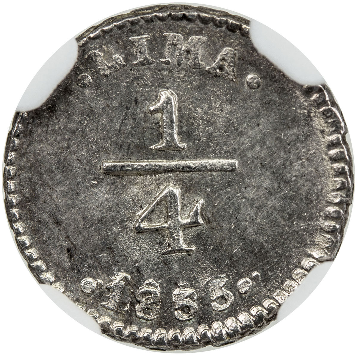 World Coins - The Americas,PERU: AR ¼ real, 1855/35, KM-143.1, may be another date underneath the 1855 besides the "35", fully lustrous, NGC graded MS64.