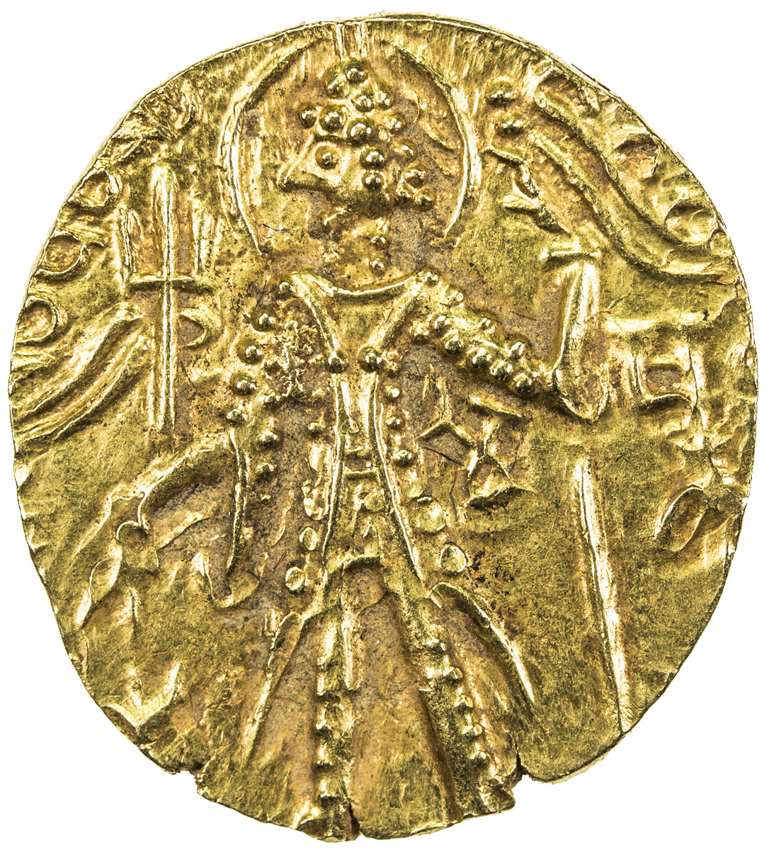 India - Ancient,KUSHAN: Kanishka II, ca. 226-240, AV dinar (7.60g), crude standing king, holding two tridents, sacrificing at altar , Siva & bull, mount removed (visible almost only on the edge), Fine to VF. Later jewelers imitation, perhaps from the Ki ...