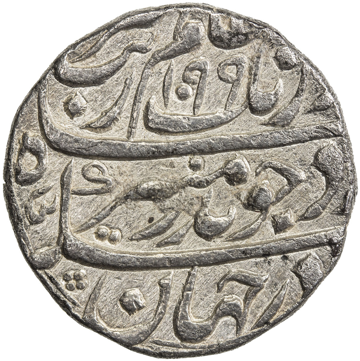 India - Mughal Empire,MUGHAL: Aurangzeb, 1658-1707, AR rupee (11.40g), Ranthambor, AH1097 year 30, KM-300.76, very rare mint in southern India, Fine to VF, RR. The mint name is abbreviated, and has been interpreted as "Ranathor".