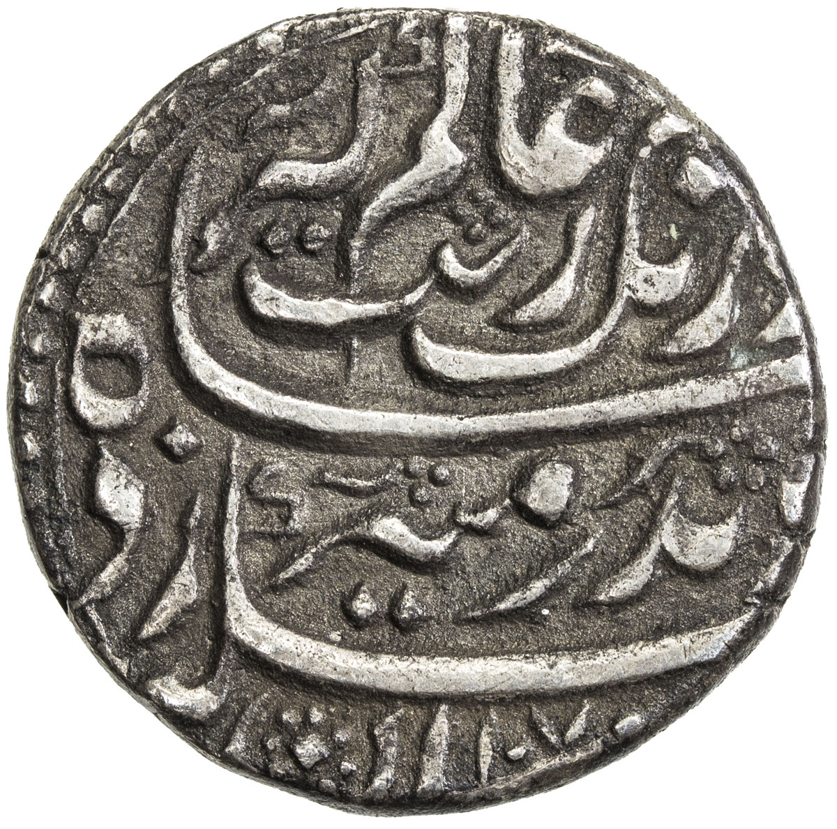 India - Mughal Empire,MUGHAL: Aurangzeb, 1658-1707, AR rupee (11.42g), Khambayat, AH1070 year 1 (ahad), KM-300.95, mint name atop the reverse, VF to EF, R.