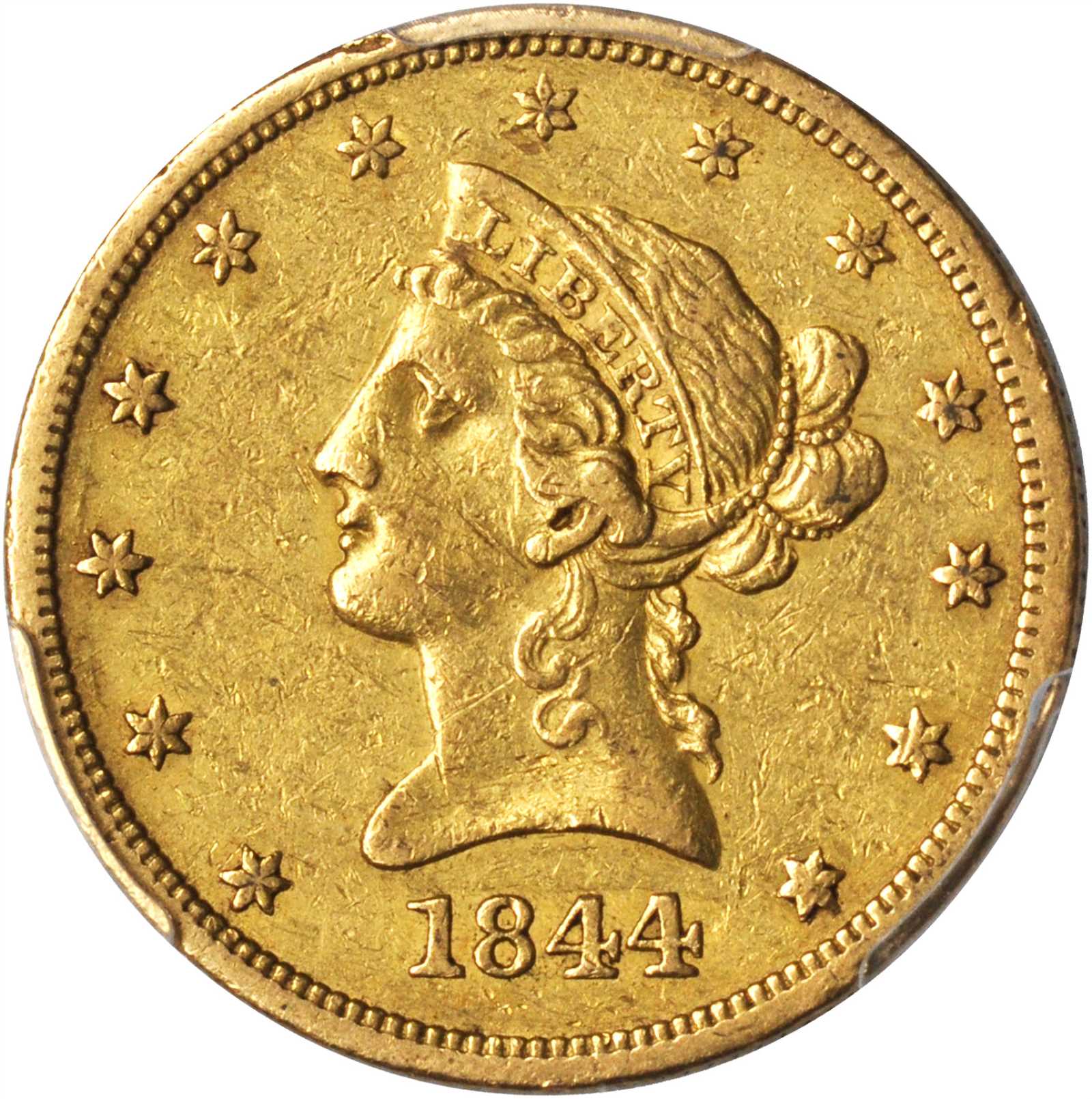 1844-O Liberty Head Eagle. EF-45 (PCGS).Handsome khaki-gold surfaces are boldly to sharply defined throughout with appreciable remnants of satiny mint luster. As the most readily obtainable New Orleans Mint eagle from the 1840s after only the 1847-O and 18 ...