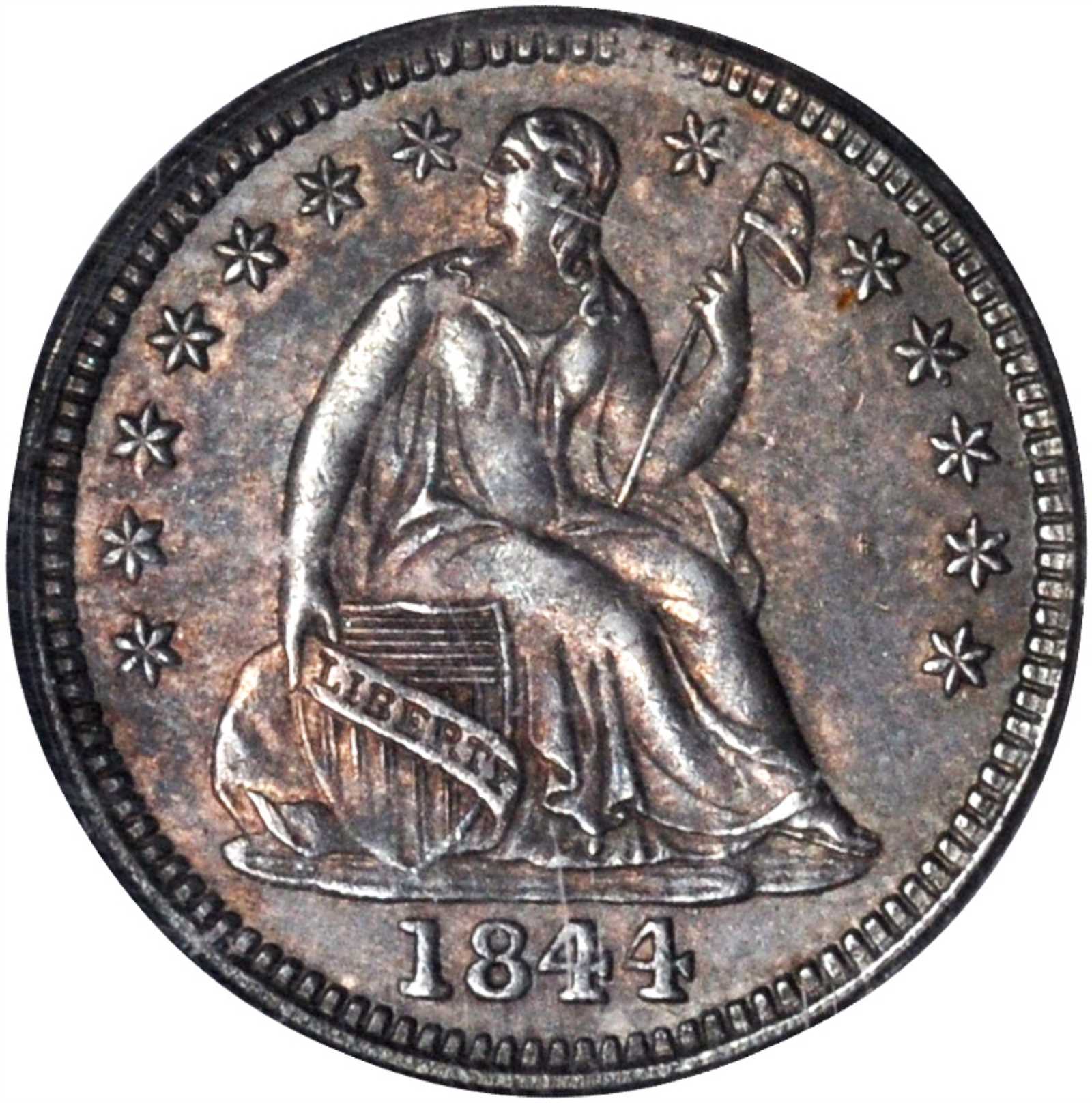 1844-O Liberty Seated Half Dime. V-2. Small O. MS-62 (PCGS). CAC.This is a richly original, boldly toned example of one of the leading condition rarities in the Liberty Seated half dime series. Dressed in blended steel, copper, blue-gray and pale rose pati ...
