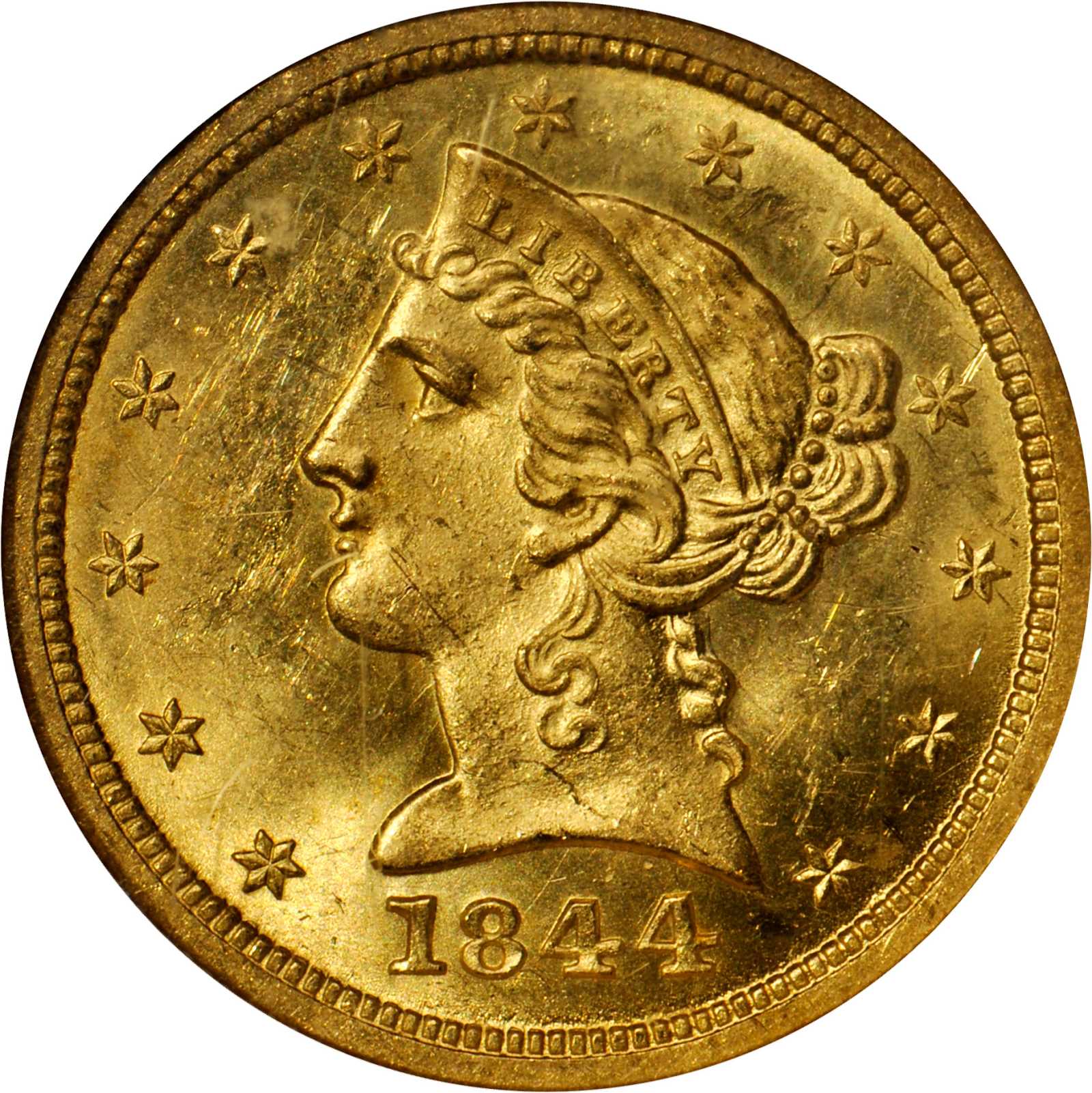 1844-O Liberty Head Half Eagle. MS-63 (NGC).This remarkable condition rarity would serve as a highlight in an advanced gold cabinet. Lively satin luster mingles with bright golden-yellow patina providing outstanding visual appeal. The strike is razor sharp ...