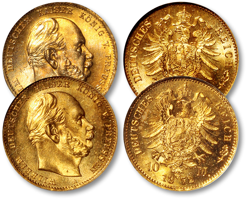 1872年德皇威廉一世像10Mark金币二枚,状态极佳,ANA MS66