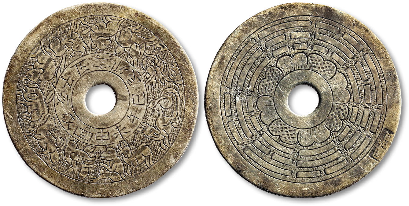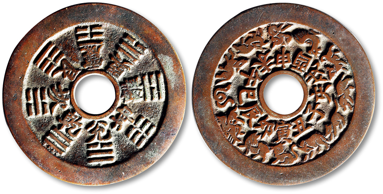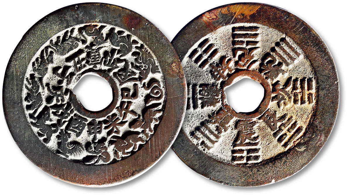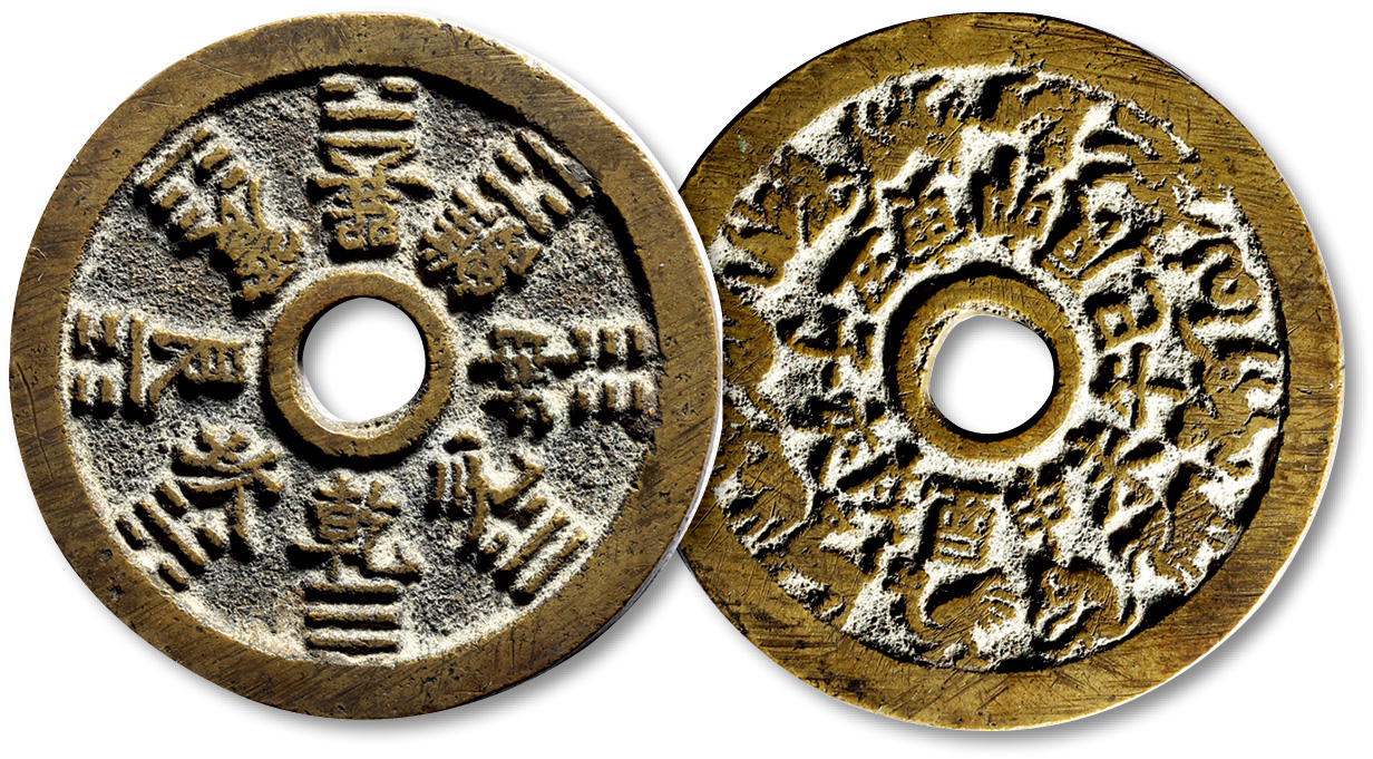 清“十二生肖”背“八卦”苏炉花钱二枚,直径分别为:44.7mm、46.2mm,极美品