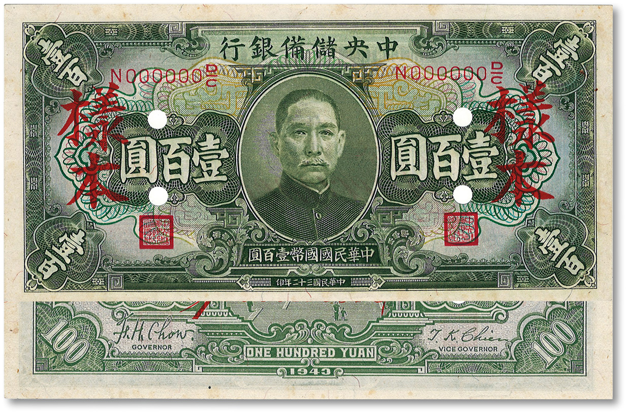 民国三十二年(1943年)中央储备银行绿色长号券壹百圆样本券,九五至九八成新