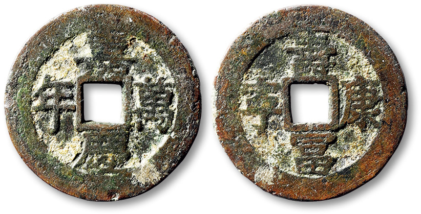 富寿康宁花钱,(55.22~55.25)*(6.95~7.08)mm 富寿康宁为大型宫钱,一般多为光背,此品背铸有花卉图案,正反边刻有回字纹图案,当为特殊用途而铸,极为少见。上美品,估价:150000元以上,起拍价:35000元。 ...