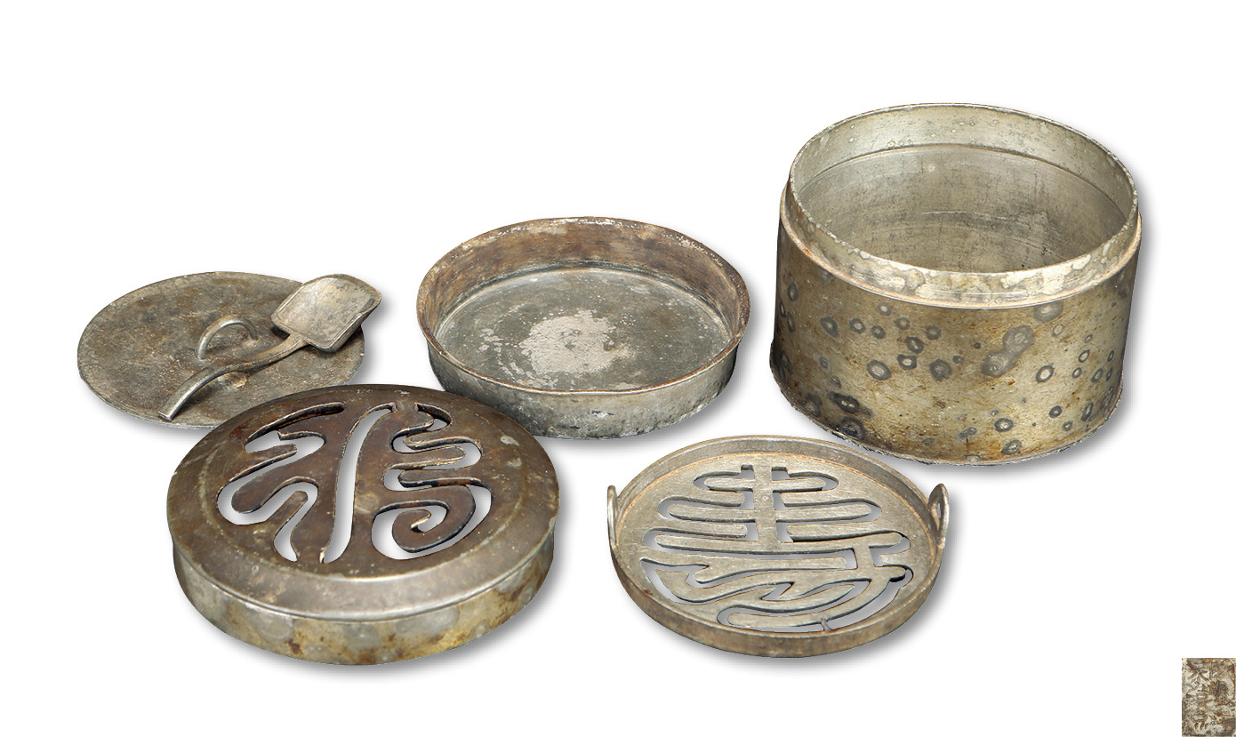 清锡制福寿双全香薰一件,直径:10CM,高:7CM,设计精巧,工艺精美,甚是有趣,少见,保存完好