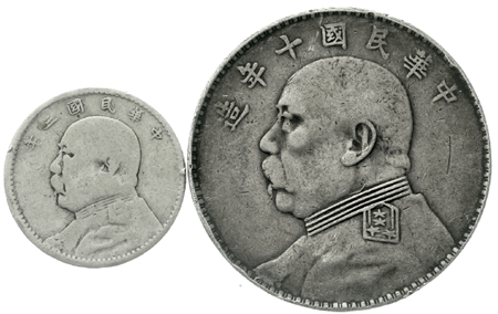 Republik 1912-1949. 2 Stuck: 20 Cents Jahr 3 = 1914 und Dollar Jahr 10 = 1921. schon/sehr schon, Kratzer, Randfehler