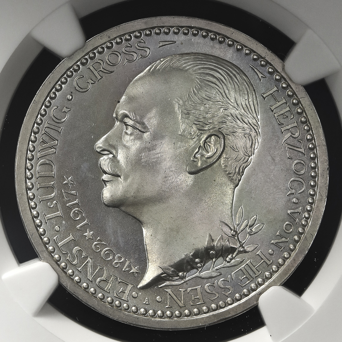 GERMANY Hesse-Darmstadt ヘッセン・ダ儿ムシュタット 3Mark 1917A NGC-PF66+ Cameo Proof FDC。J-77 KM-376 エ儿ンスト・儿ードヴィヒ治世25周年 制造1333枚 ⓇⓇ このコインはプ儿ーフのみの発行で枚数も1333枚之记録上では多く作られたもののカタログ価格(PF63 $7500)が示 ...
