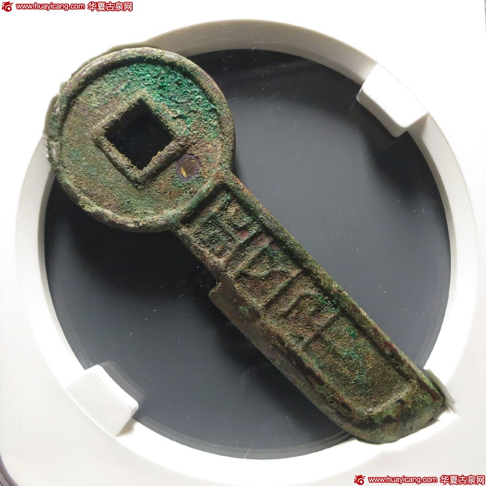 一刀平五千(华夏评级-极美品(XF)85),通长约:74mm 铜范版一般多轻薄,此品整体规矩精整,钱体厚重,估价:100000元以上,起拍价:50000元。