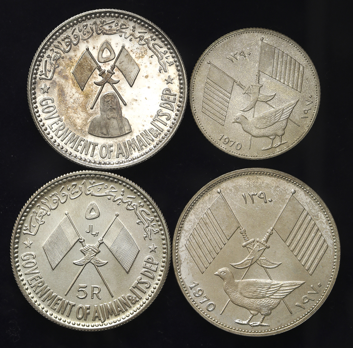 U.A.E アラブ首长国连邦 Ajmanアジュマーン 2Riyals 1969/5Riyals 1970(×2),71 返品不可 要下见 Sold as is No returns UNC&Proof。KM-2,3,12,27,返品不可 要下见 Sold as is No returns