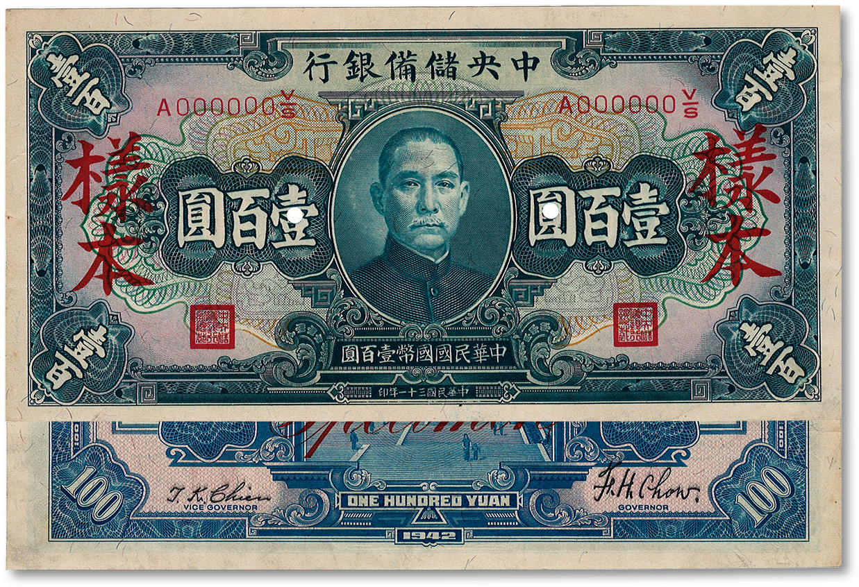1942年中国银行500元样钞,PMG63NET, 有胶水渍. 中国纸币 (1949前). Bank of China, 500 yuan, specimen, 1942, serial number 00000, (Pick 99s), PMG 63 NET Choice Uncirculated (previously mounted)