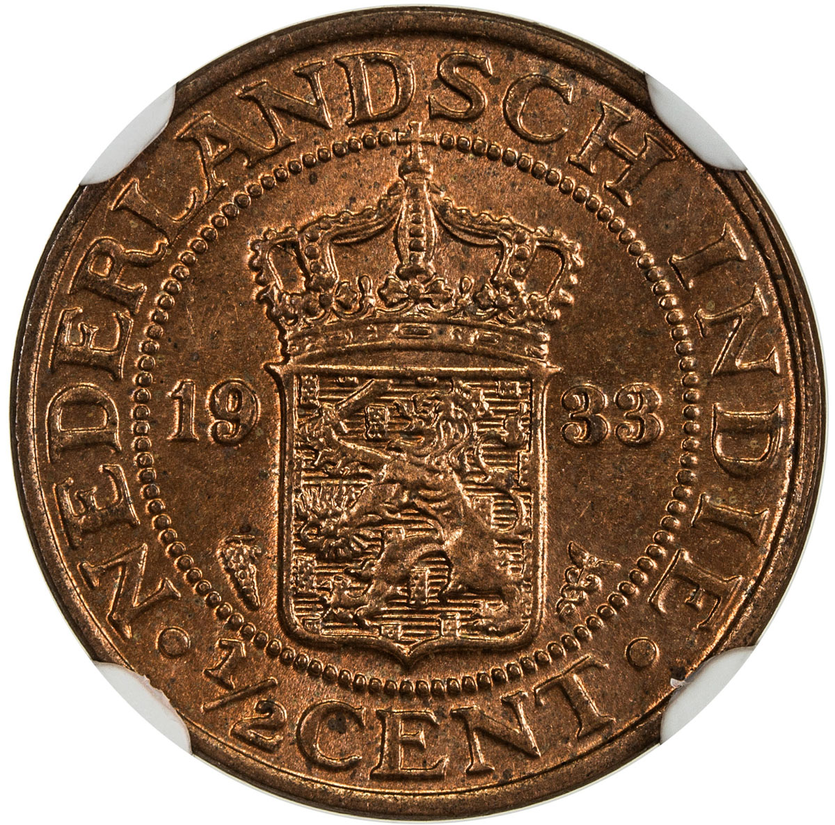 World Coins - Asia & Middle-East,NETHERLANDS EAST INDIES: Wilhelmina I, 1890-1948, ½ cent, 1933(u), KM-314.2, key date, with grapes as the mintmasters mark, NGC graded MS64 RD.