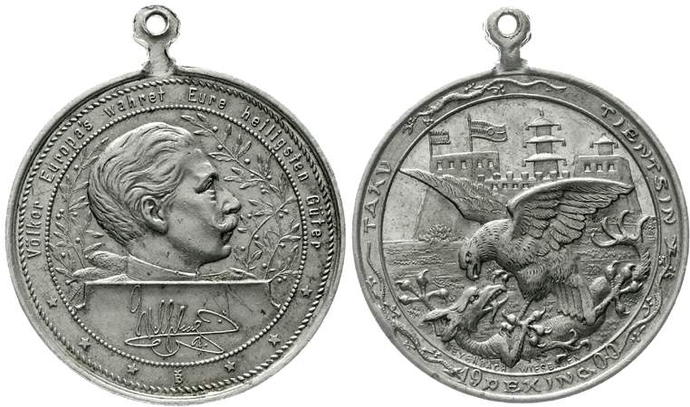 Qing-Dynastie. De Zong 1875-1908. Tragbare Aluminiummedaille 1900 von Beyenbach. Niederschlagung des Boxeraufstandes in Taku, Tientsin und Peking. 39 mm. vorzuglich