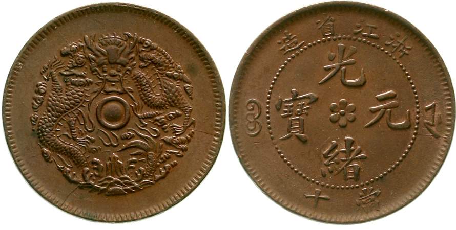 Qing-Dynastie. De Zong 1875-1908. 10 Cash Bronze o.J., gepragt 1903/1906. Provinz Chekiang Yeoman 49 vorzuglich/Stempelglanz