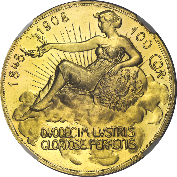 AUSTRIA Franz Josef I フランツ・ヨーゼフ1世(1848~1916) 100Corona 1908 NGC-PF62 Proof -UNC。Fr-514 KM-2812 治世60年 云上の女神,NGC-PF62