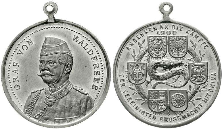 Qing-Dynastie. De Zong 1875-1908. Tragbare Aluminiummedaille 1900 von Beyenbach. Graf v. Waldersee und die Kampfe der vereinigten Grossmachte mit China. 39 mm vorzuglich, Randfehler, berieben