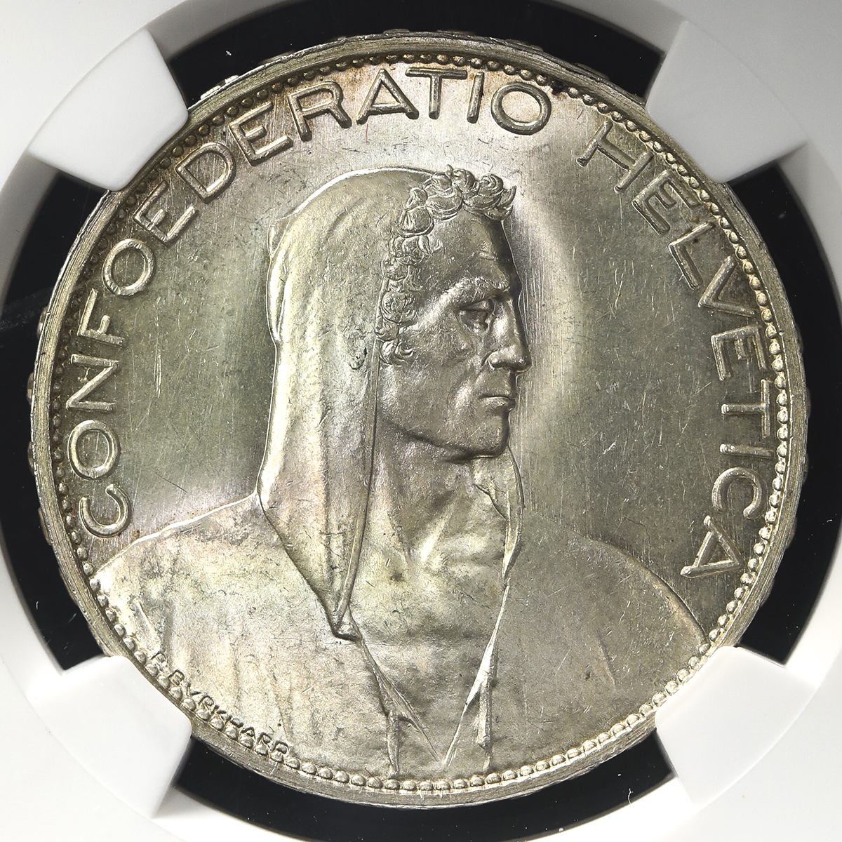SWITZERLAND Confederation スイス连邦 5Francs 1925B NGC-MS64+ UNC+。Dav-394 KM-38 ウィリアム・テ儿,NGC-MS64+