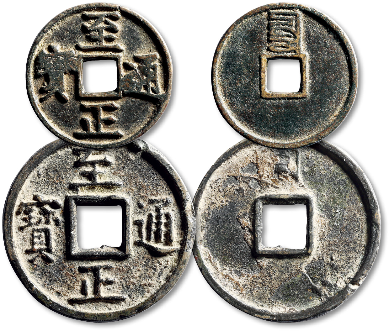 “至正通宝”折三背“辰”一枚、折十一枚,共二枚,直径分别为:34.1mm、44.6mm,美品