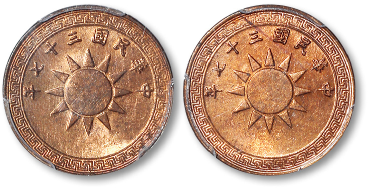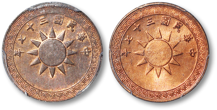 民国三十七年党徽背布图一分铜圆一枚,光度一流,金盾PCGS MS63RD、MS63BN