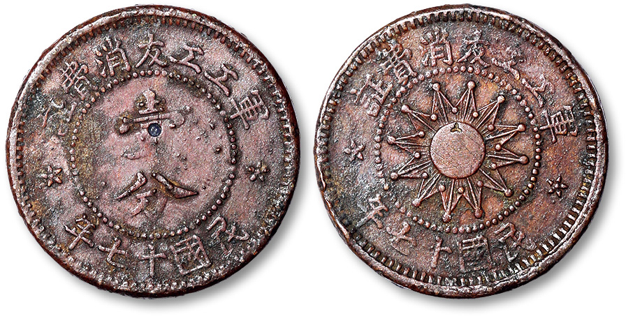 民国十七年军工工友消费证壹分铜圆一枚,红铜厚版,极美品