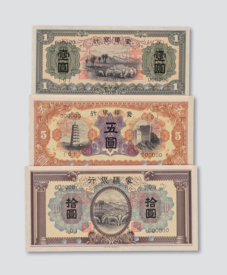 40年代蒙疆银行纸币7枚一组,面值由一角至一佰圆,VF-EF。Mengchiang Bank,group of 7 notes, from 1 jiao to 100 yuan, 1940 s,mixed condition, about very fine to extremely fine (7)
