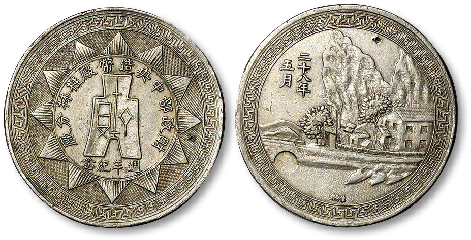 民国二十八年五月财政部中央造币厂桂林分厂周年纪念铜镀镍纪念章一枚,雕刻大师黄伟存刻模,红铜镀镍,图案打制精美,原色包浆,品相上乘,马定祥旧藏,极美品