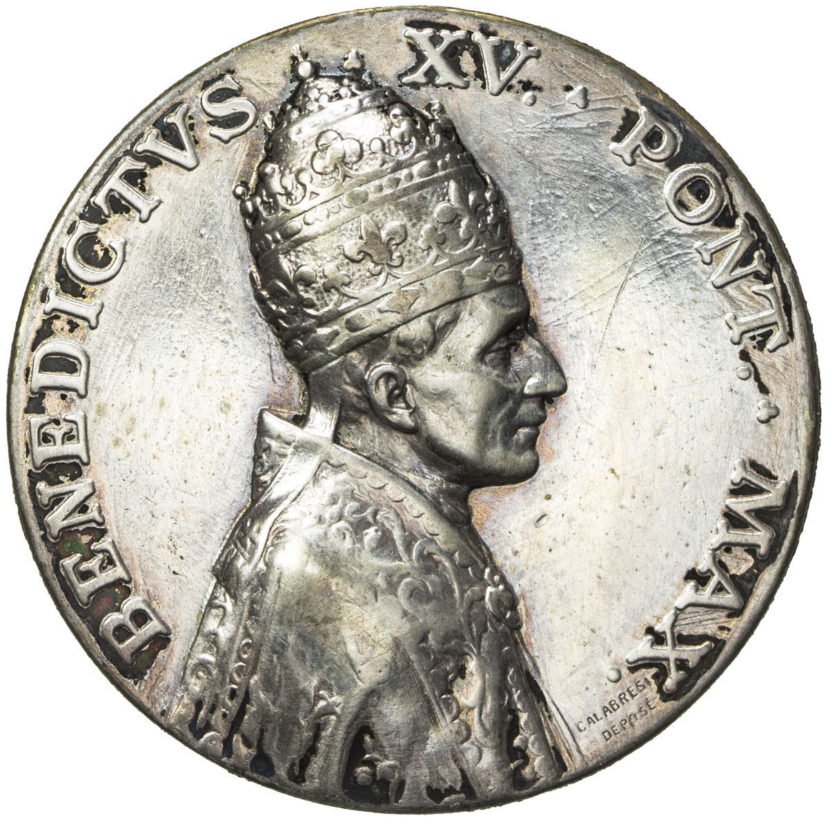 World Coins - Europe,VATICAN: Benedict XV, 1914-1922, AR medal, ND, Rinaldi-102, 32mm, silver commemorative medal by Calabresi, BENEDICTVS XV PONT. MAX., bust right, wearing zucchetto, mozzetta, and pallium, CALABRESI DEPOSE at lower right , MARIA IMMAC., ...