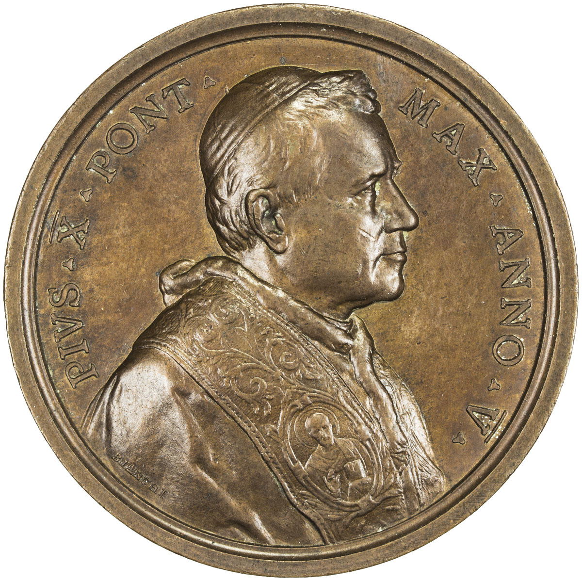 World Coins - Europe,VATICAN: Pius X, 1903-1914, AE medal, 1907, Rinaldi-102, 44mm, bronze annual medal by Biachi, PIVS X PONT. MAX. ANNO V, bust right, wearing zucchetto, mozzetta, and pallium , MODERNISMI. ERRORE. DAMNATO, audience scene with Pope Pius ...