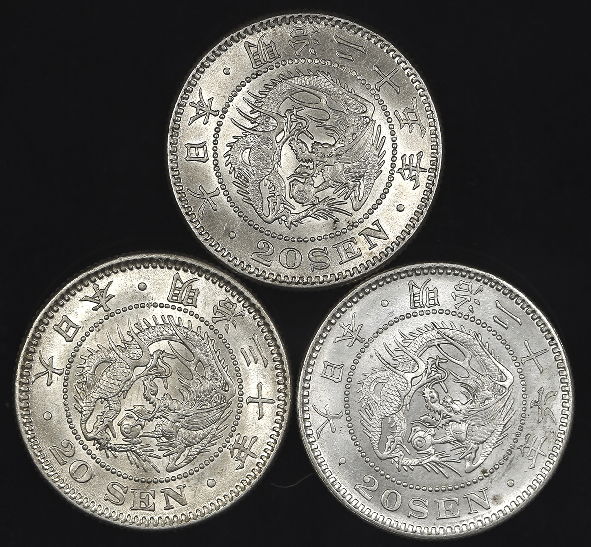 日本 竜二十銭银货 Dragon 20Sen 明治25,26,30年 计3枚组 3pcs 返品不可 要下见 Sold as is No returns FDC。JNDA01-21 KM-Y24 FDC