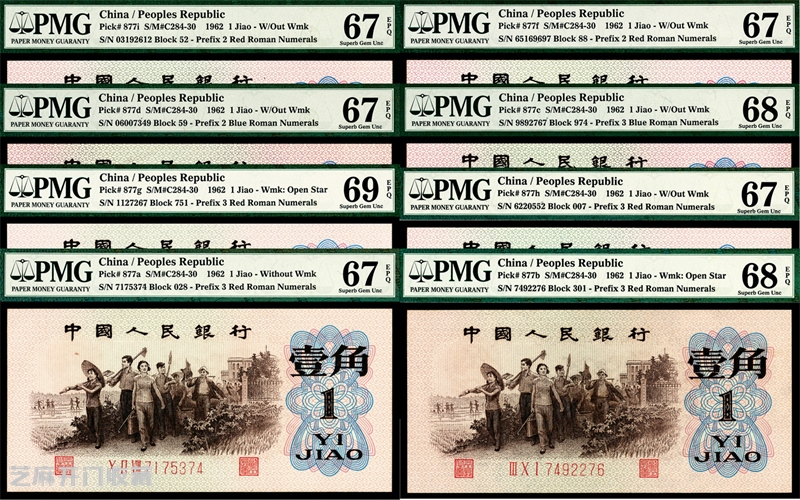 4:1962年第三版人民币壹角一组八枚,教育与生产劳动结合图,版别均不相同,PMG 67 EPQ至PMG 69 EPQ,估价:RMB 30000,成交价格: RMB 71300,拍卖公司:宜和,拍卖专场: 宜和2024杭州春拍-纸钞,成交时间: 2024-06-02 18:00:00。 在目前的收藏市场中,钱币的造假方式有很多种,比如说可以通过水洗的方式,把那些品相较差的钱币用清水,或者是采用特殊的药物进行清洗,然后再把钱币进行压平,这样就能够得到一张品相较好的纸币,而且从整体的外观上看上去是没有任何的折痕,就像没有流通过一样。还有一种是利用裁切的方式,把旧币进行加工翻新,我们都知道使用过的人民币,上面多多少少都会出现边角磨圆,或者是产生一些污渍,所以他们就会把纸币的四周裁去,重新拼接出一张四角尖。